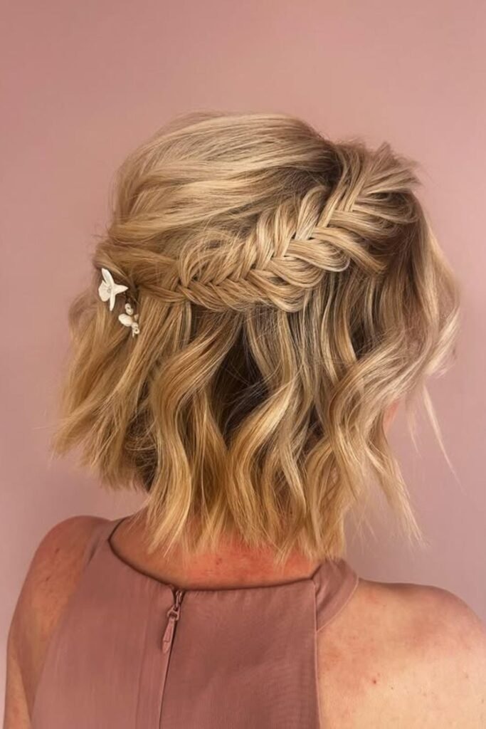 Create a small fishtail braid on one side and twist it back toward the ear. Secure it with a pin.