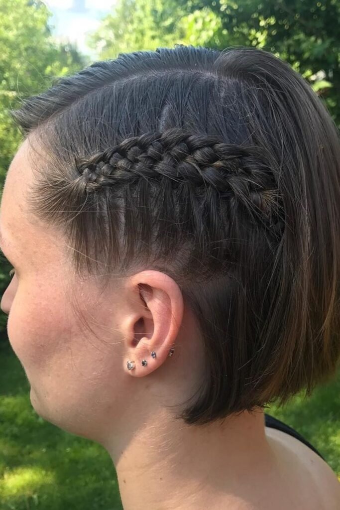 The ribbon side braid adds softness and detail. It works well on short hair with layers.