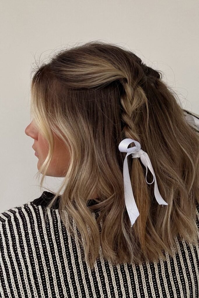 Create a small French braid along one side of the head and weave a thin ribbon through it. Secure the end neatly.