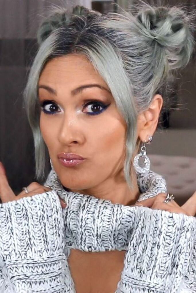 Playful space buns add fun to short hair. They work best when placed slightly higher on the head.