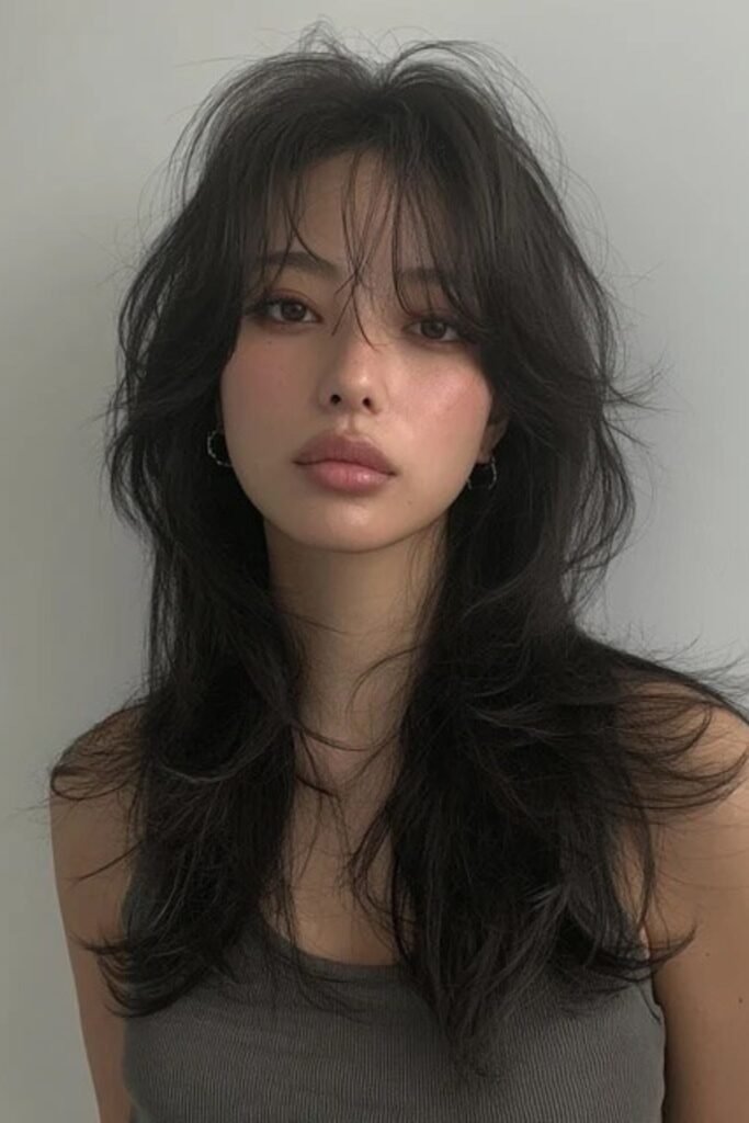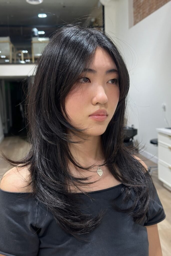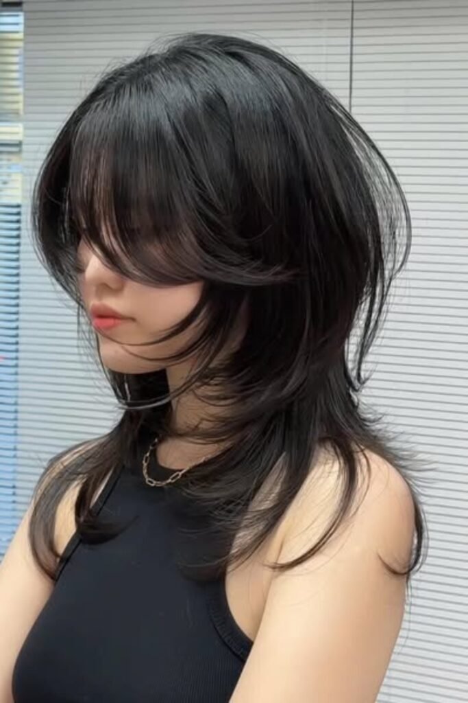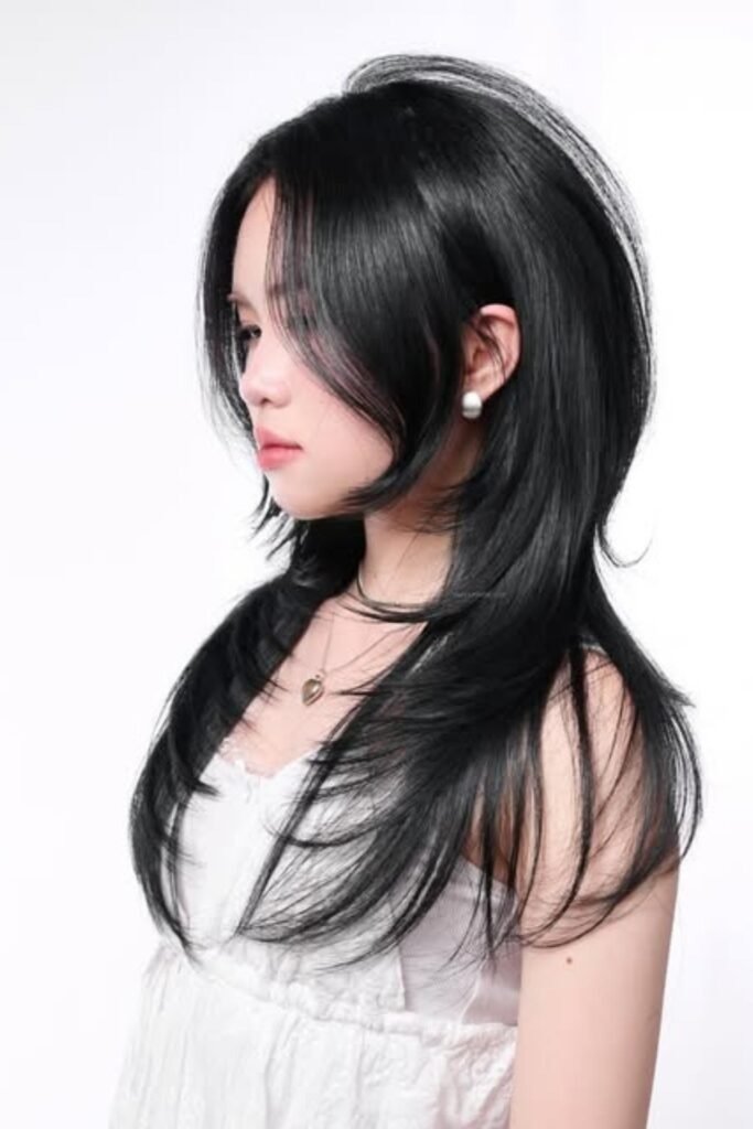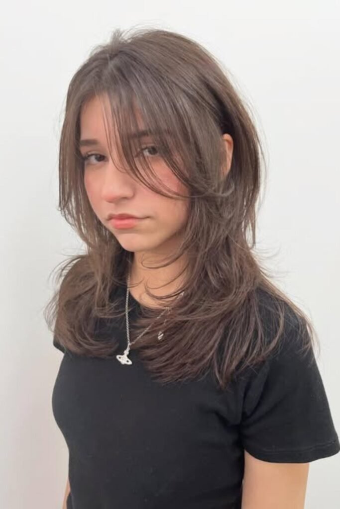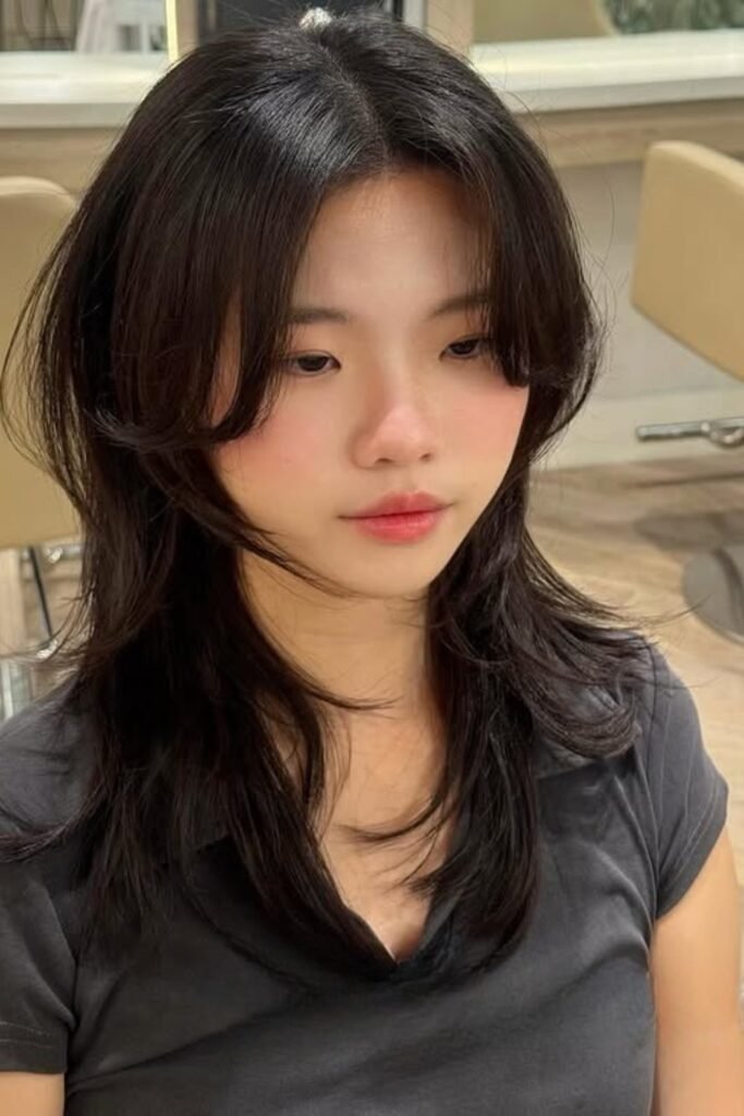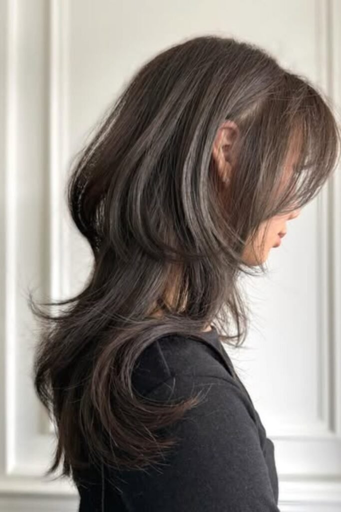 Layered face curve emphasizes natural face contours. The hush cut’s layers curve gently around cheeks and jawline, softening features and adding lightness. This style is adaptable for medium to long hair and works well with straight or wavy textures. Styling requires gentle air-drying or a round brush for volume.