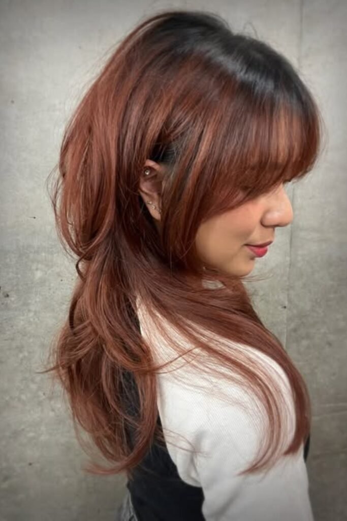 A soft auburn cascade brings warmth and shine to a layered hush cut. The auburn tones highlight layers while adding depth to medium or long hair. This style is elegant and versatile, suitable for both casual and formal settings. Soft curling or air-drying enhances the cascading effect, giving layers a natural shine.