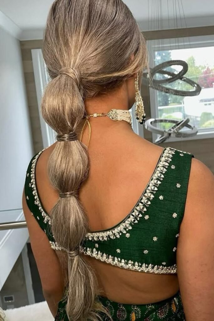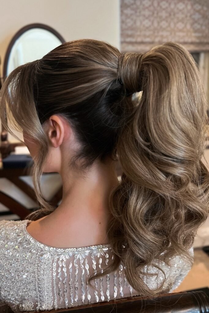 It is a great choice for receptions and evening events. The height helps balance rich sarees and lehengas. With the right base, this ponytail stays in place even during long hours of movement.