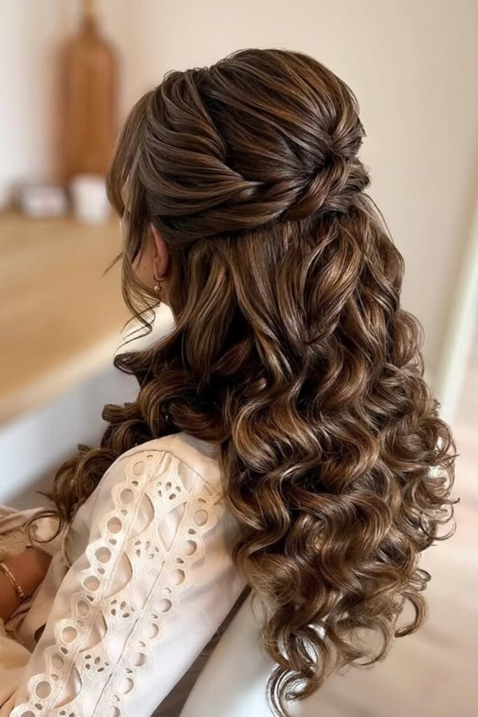 Half-up twisted curls are loved because they feel light and open. The front sections are twisted and pinned back, while the rest of the hair flows in loose curls. This style suits women who want their hair down without it falling on the face.