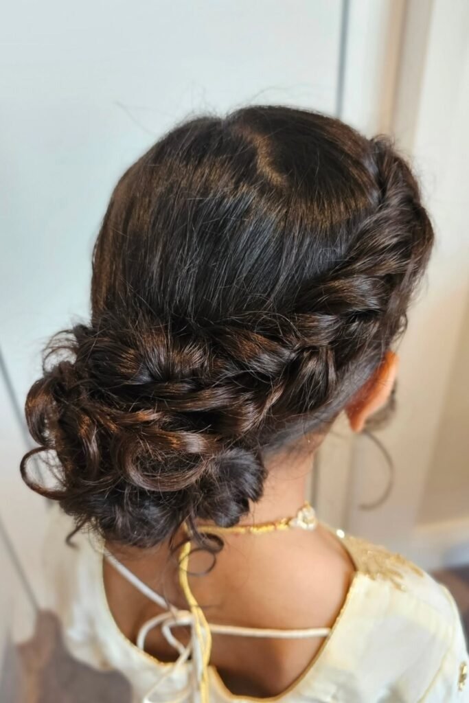 It is perfect for weddings and temple events. The hairstyle feels festive without needing heavy styling.
