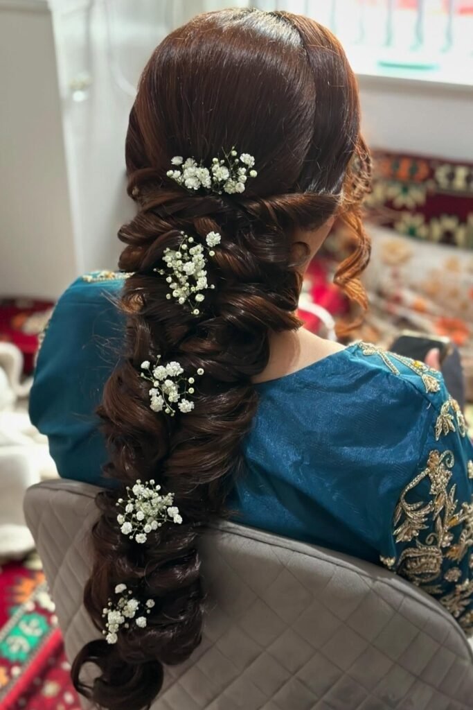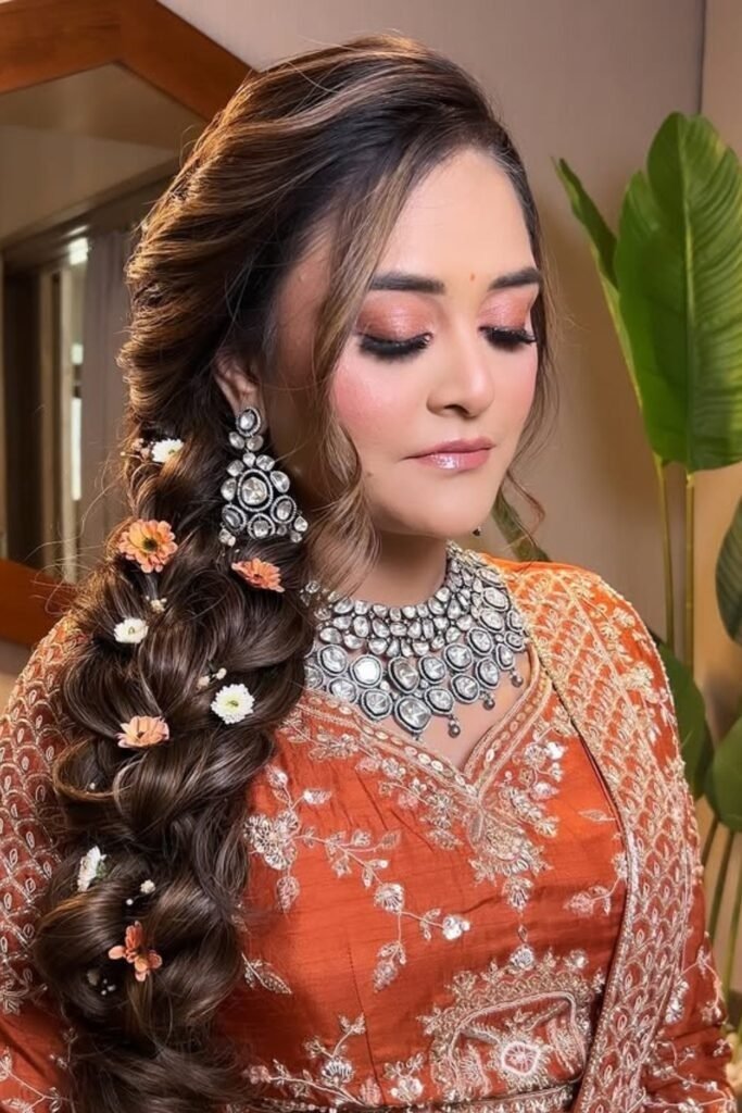 A side floral braid feels romantic and traditional at the same time. The braid starts from one side and rests over the shoulder. Fresh or artificial flowers are tucked into the braid for a soft look.