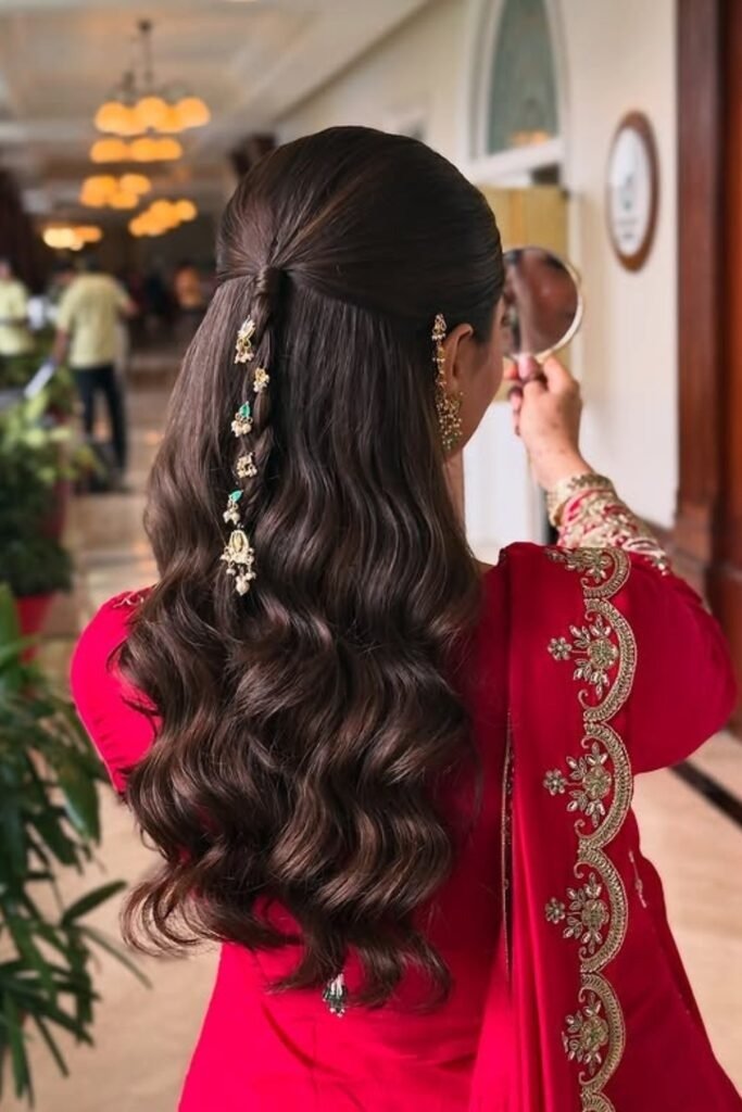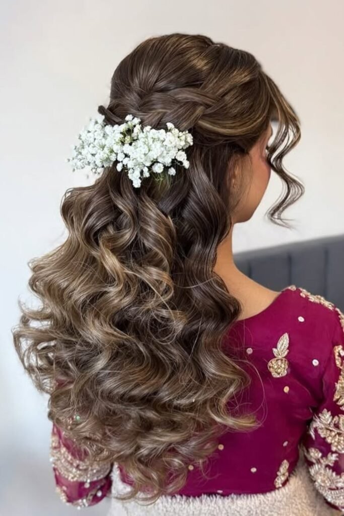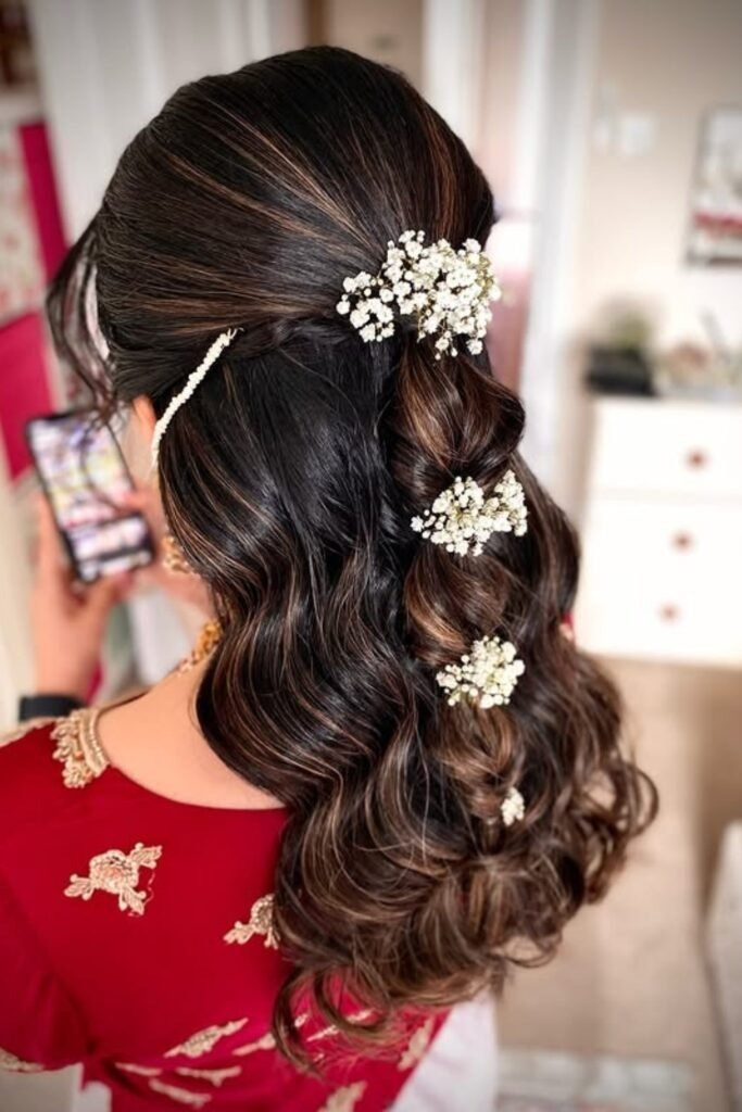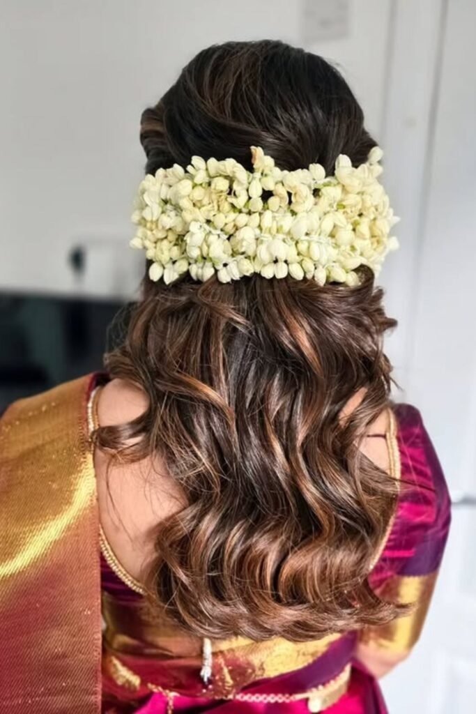 This hairstyle adds a playful touch to Indian looks. The half-up section is tied into small bubble shapes, and flowers are placed between them. The rest of the hair stays loose.