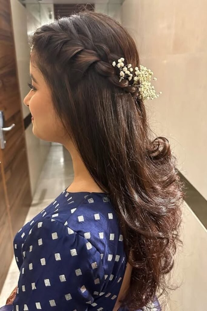 This hairstyle works well with modern sarees and fusion outfits. It is ideal for evening parties and receptions.