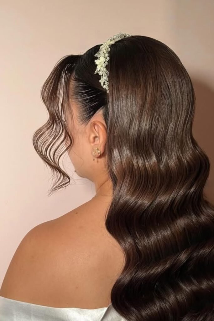 Smooth waves styled away from the face give a clean and polished look. A thin hairband adds an Indian touch without overpowering the style.