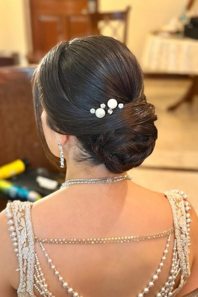 A low bun styled neatly and decorated with pearl pins feels refined and calm. The bun sits at the nape and has a smooth finish.