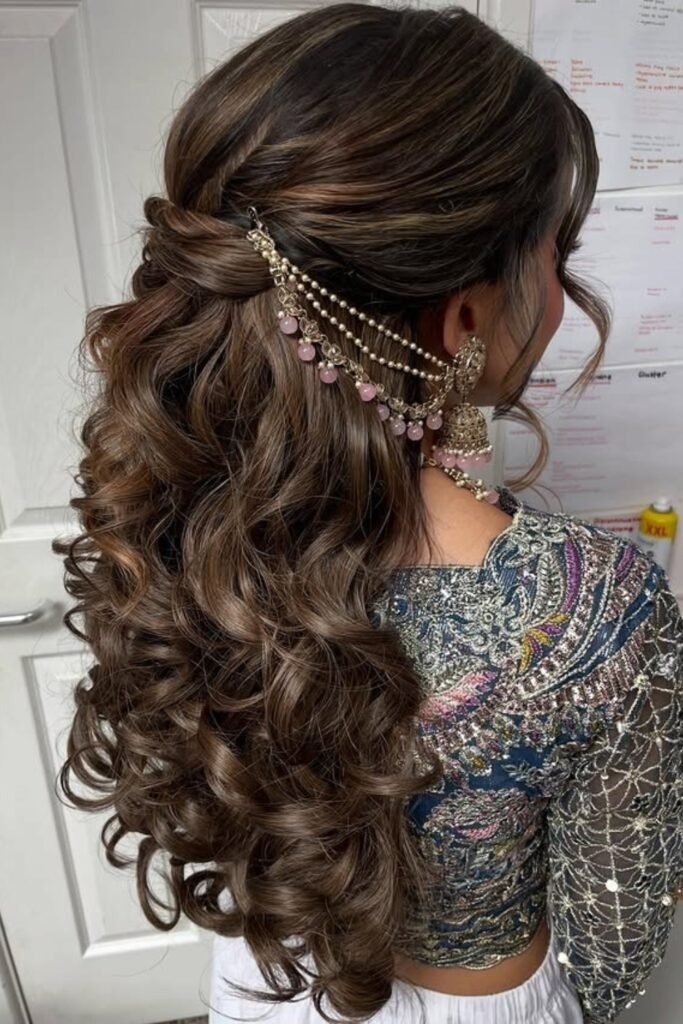 This hairstyle focuses on crown volume and bold hair jewelry. The half-up section is lifted, and the rest of the hair flows naturally.