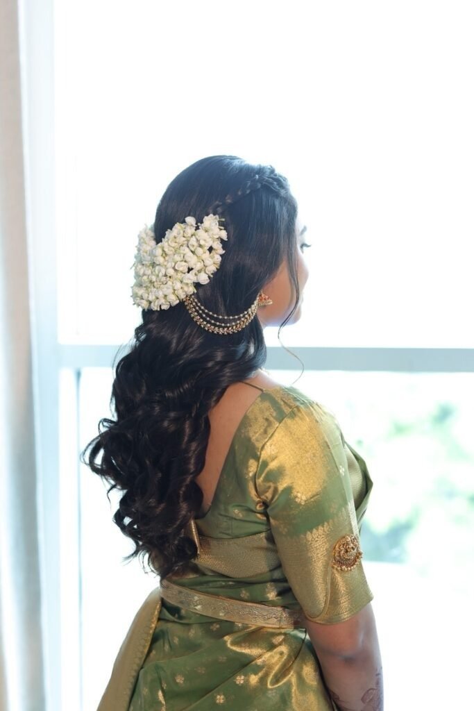 This style features a long, thick braid decorated fully with flowers. It is rooted in South Indian tradition and still widely loved.