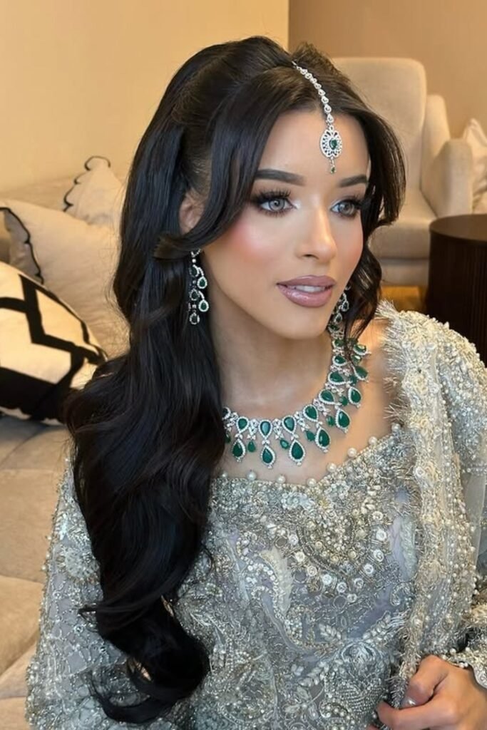 A clean center part with a maang tikka is timeless. Hair is either left in waves or pulled into a low bun. The focus stays on the face and jewelry.