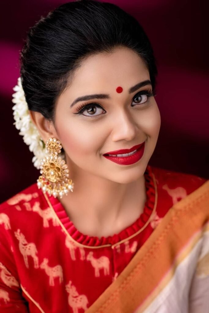 Deep red lips with defined brows and gold eyeshadow reflect South Indian bridal style.