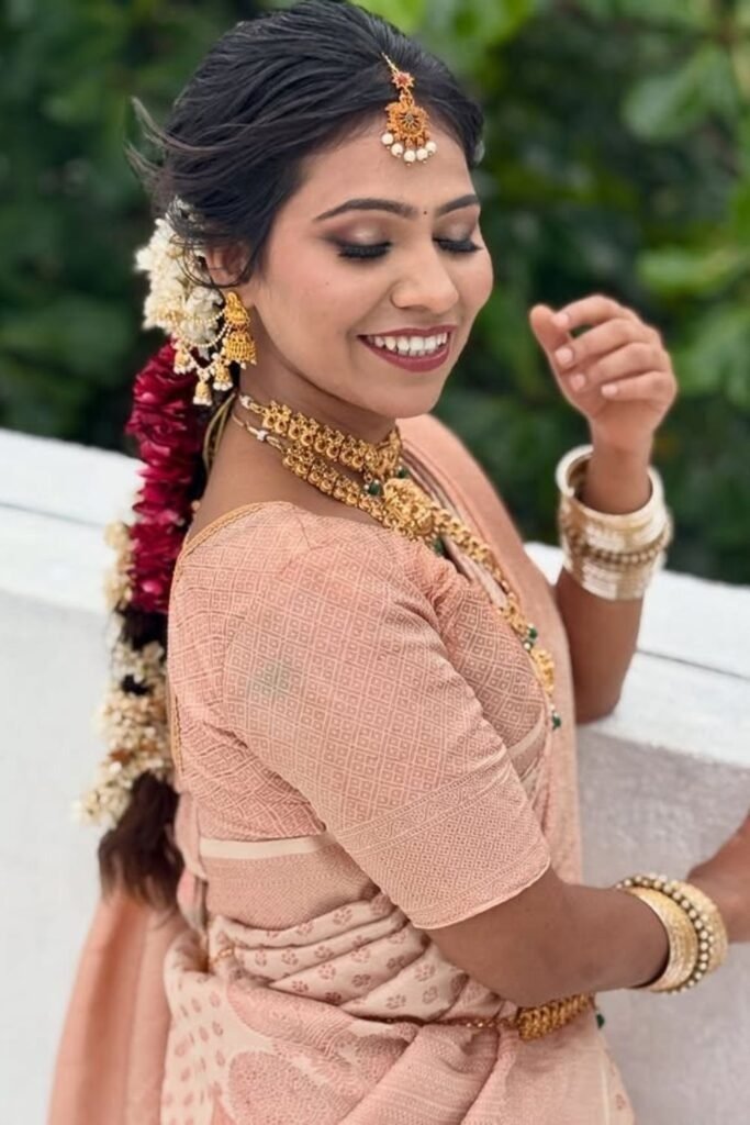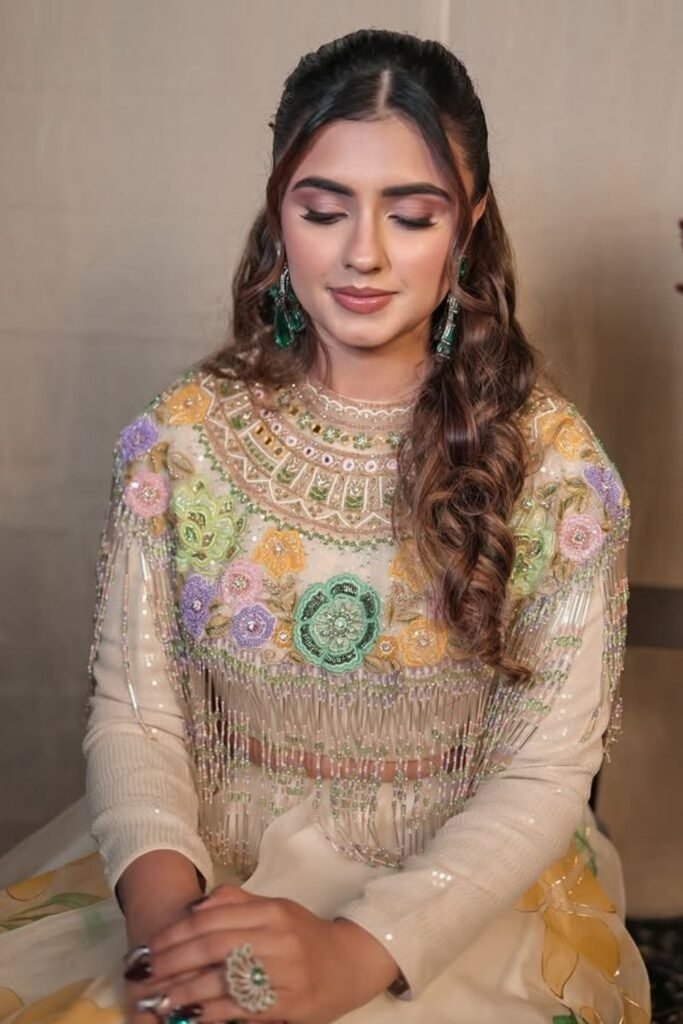 This style suits engagement events and light bridal functions. It flatters medium and fair skin tones.