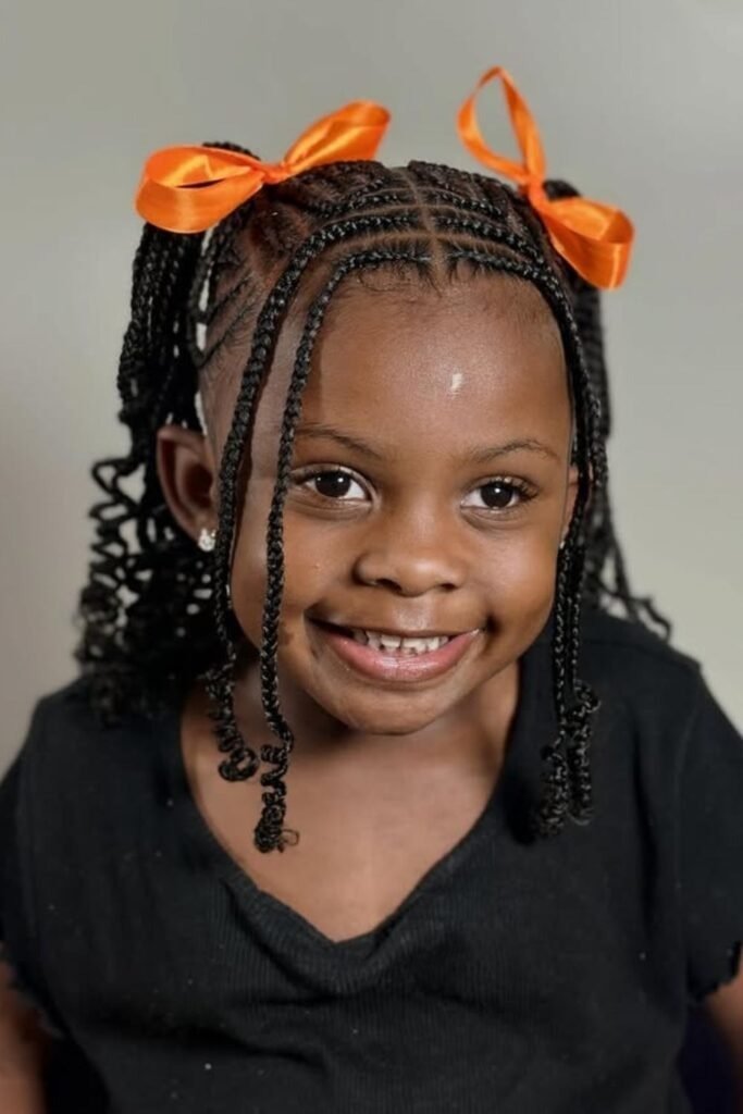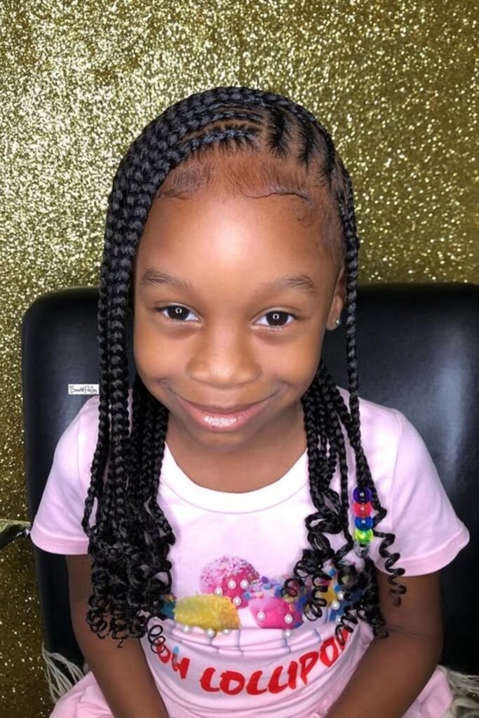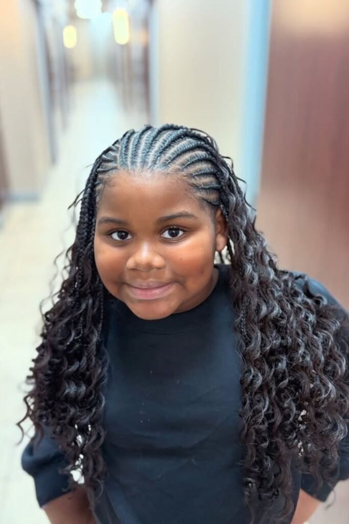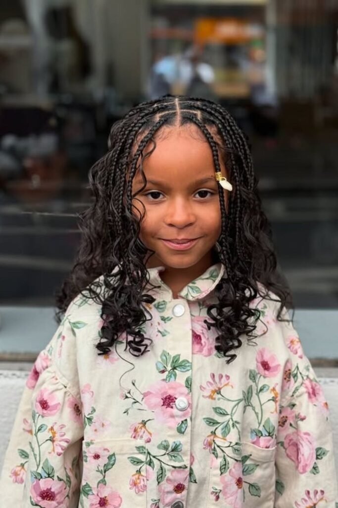 This look is soft and flexible. It suits both casual and dressy moments. Kids enjoy the freedom of curls with the comfort of braids.