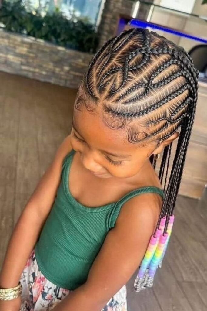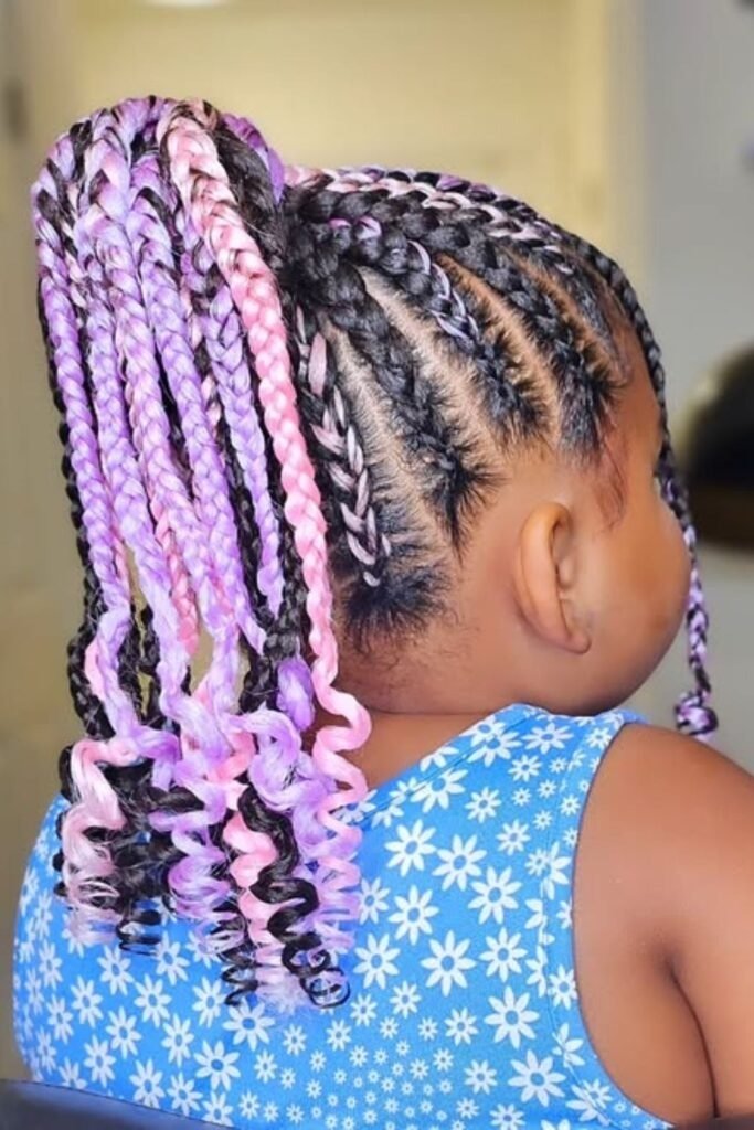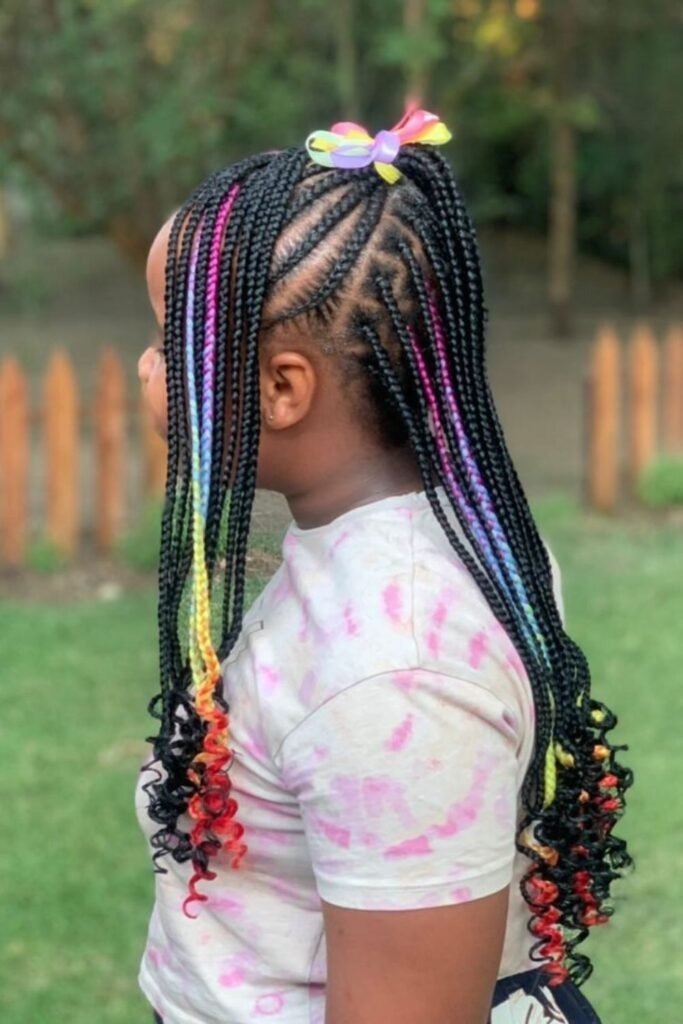 Rainbow braids add color without harming natural hair. Instead of dye, colorful extensions or threads are blended into the braids. This allows kids to enjoy bright styles safely. The colors can be soft or bold depending on preference.
