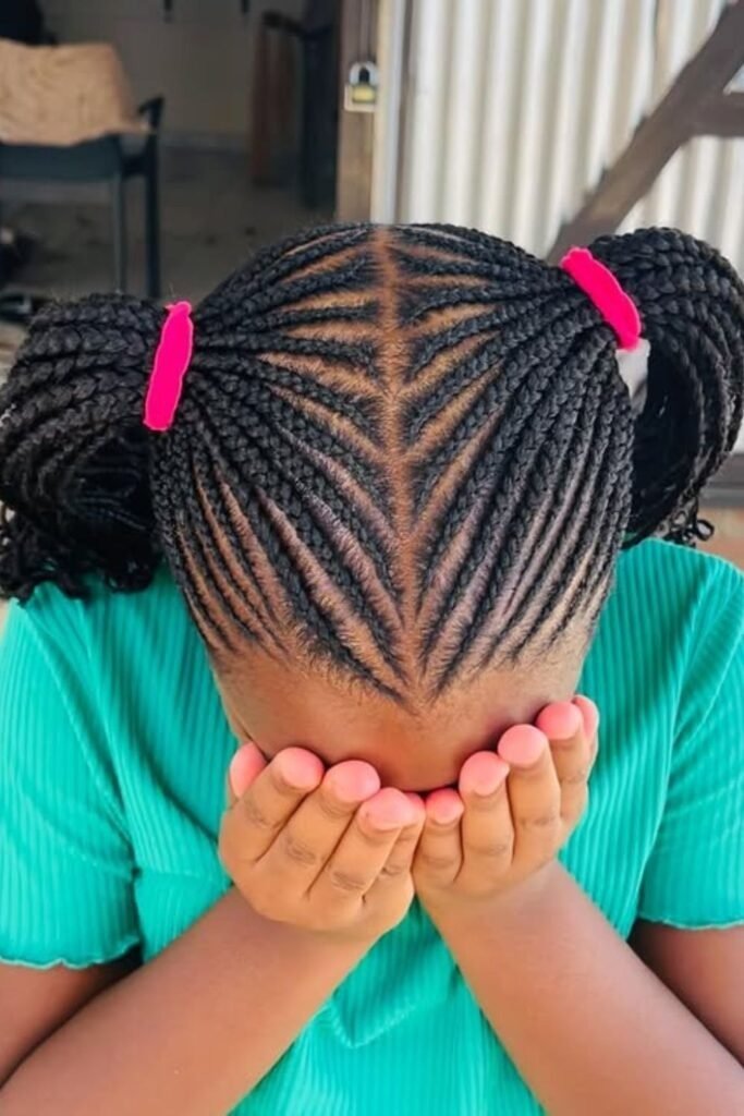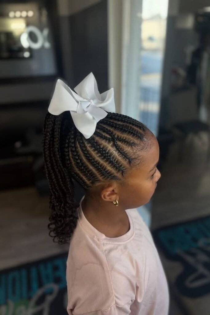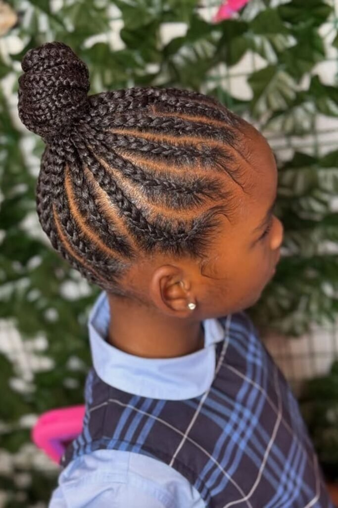 Side cornrows keep hair close to the scalp, which helps reduce daily frizz. They are easy to maintain and perfect for active kids. This style also looks great with natural edges left soft and curly.
