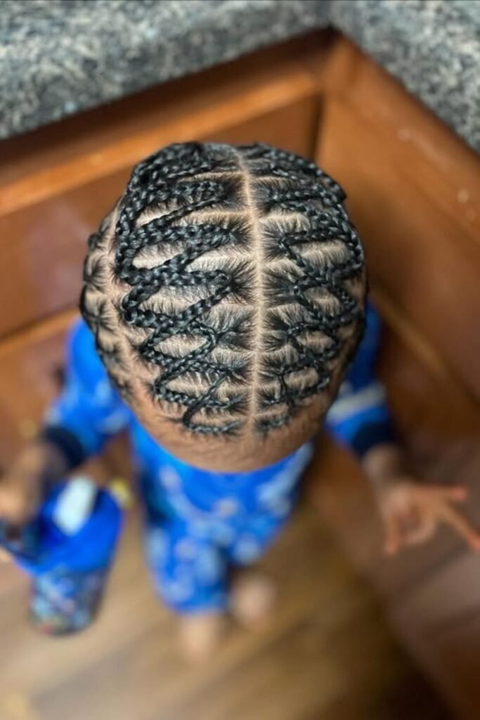Curved cornrows create soft shapes across the scalp. Instead of straight lines, the braids follow gentle curves. This makes the style look artistic while staying neat. Curved cornrows work well for kids who want something different but still simple.