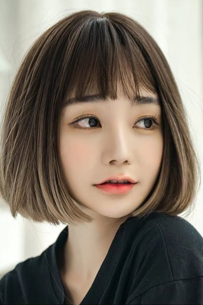 Korean girls often choose styles that make the face look slim. Hair is shaped to curve around the cheeks and jaw. Bangs are light and slightly parted. Even short cuts have movement.