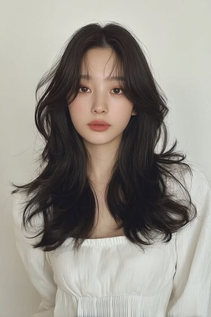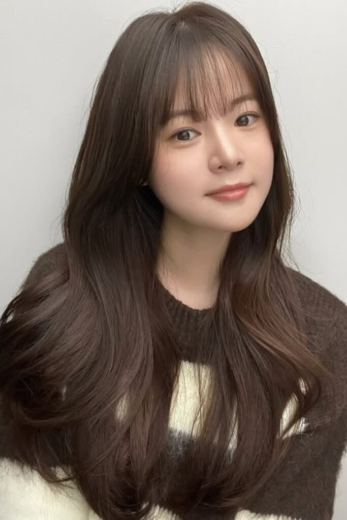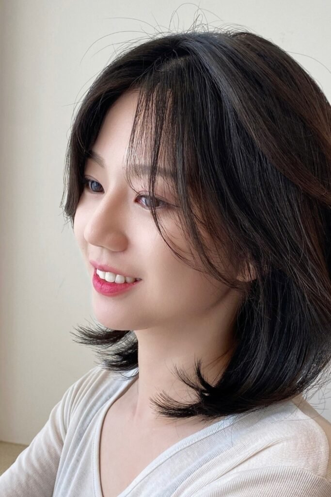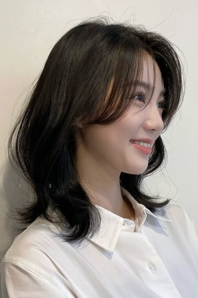 It balances volume at the crown with softness at the ends. It is a timeless Korean hairstyle.