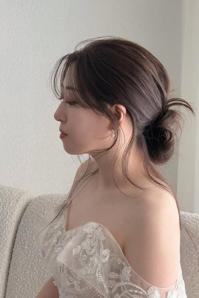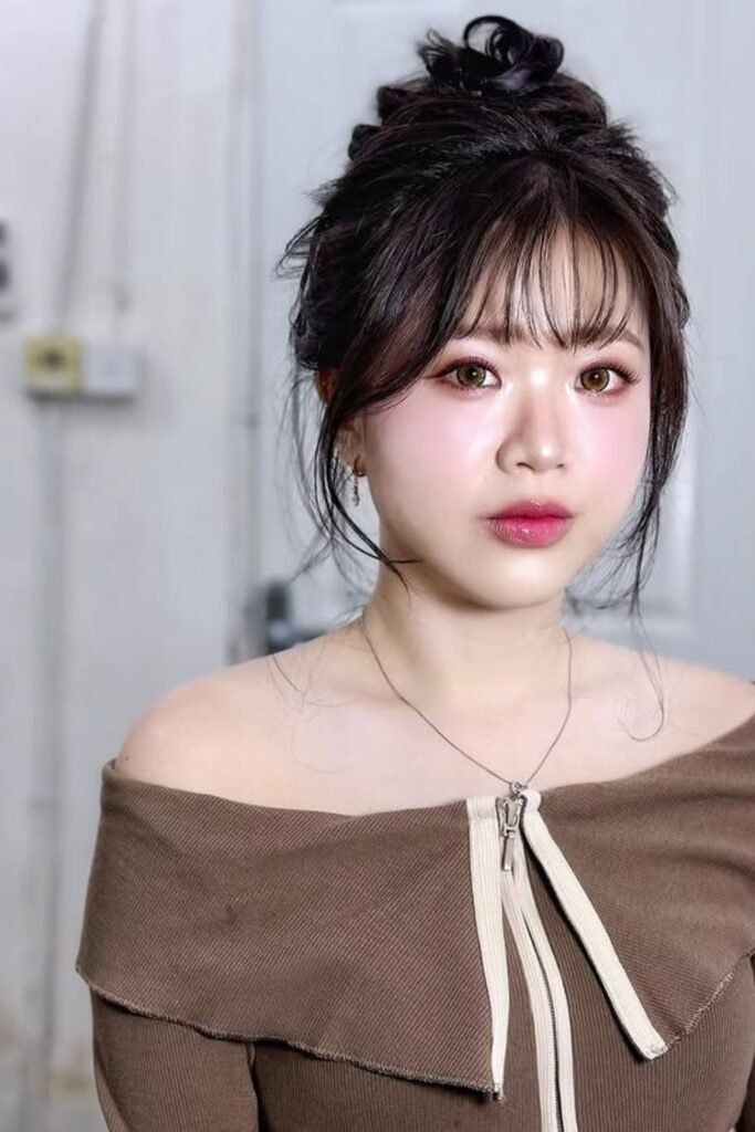 See-through bangs are very popular in Korea. They show a bit of forehead. This makes the face look fresh and young. The messy bun keeps the look casual.