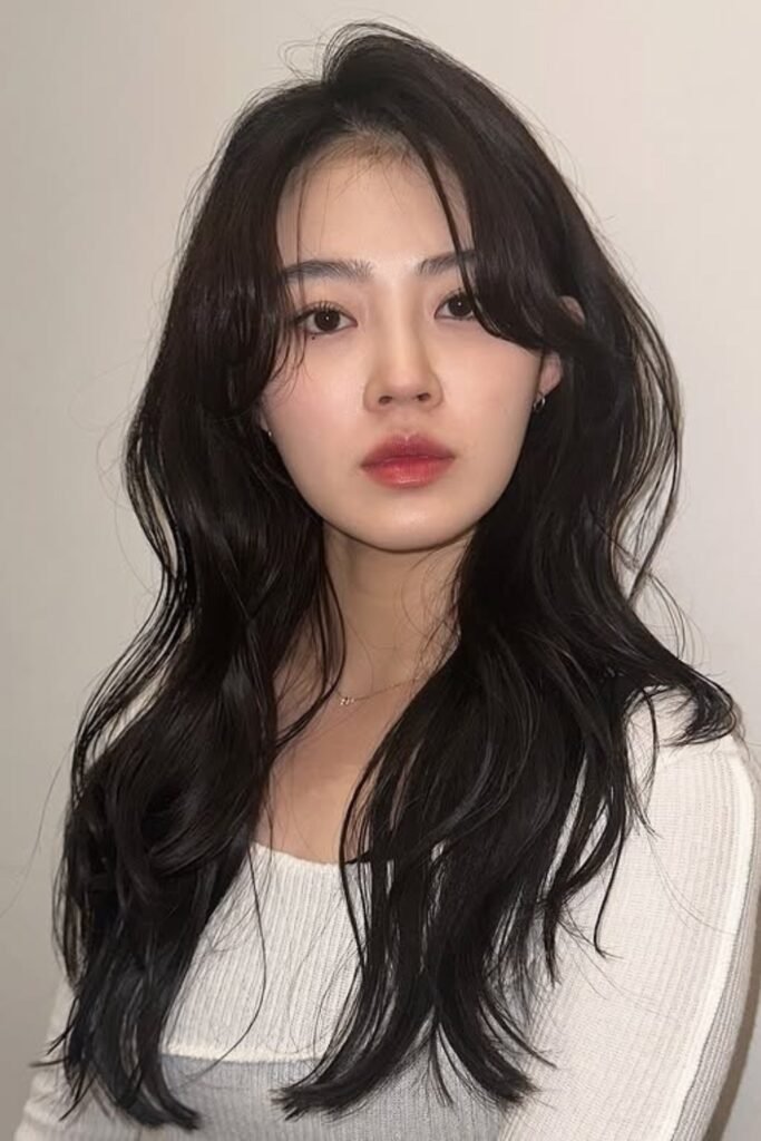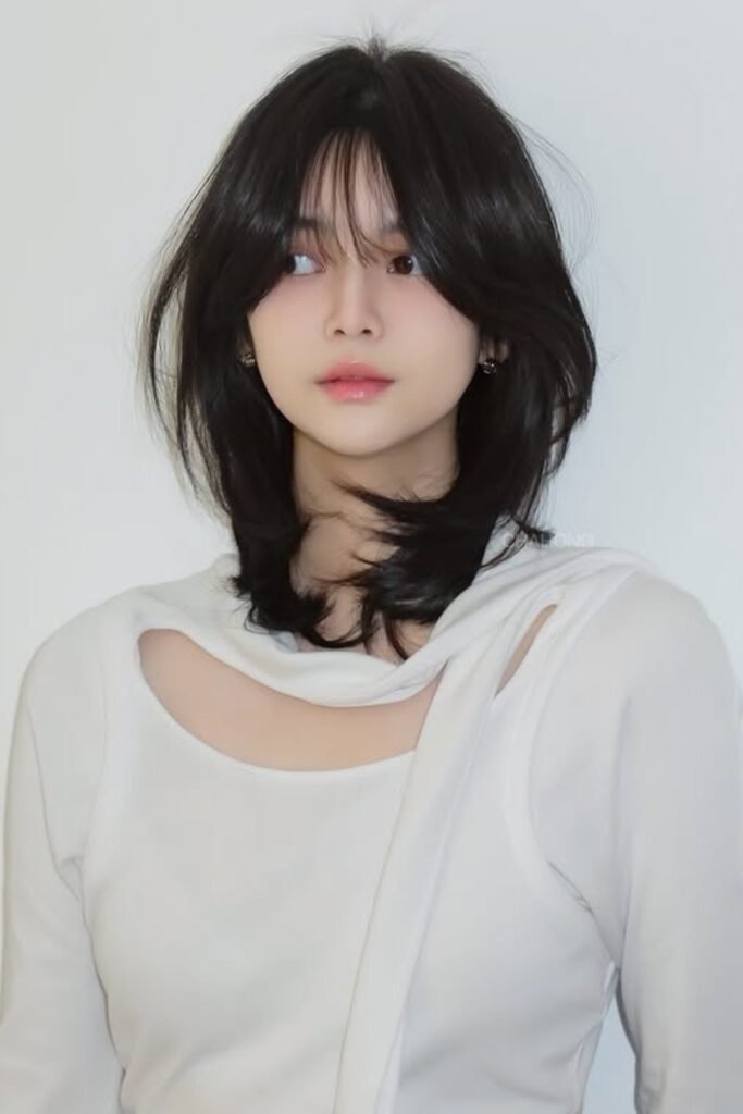 The key here is precision. The part must be clean. The shine must be smooth, not oily. This Korean hairstyle works best for medium to long hair. It suits oval and heart-shaped faces very well.