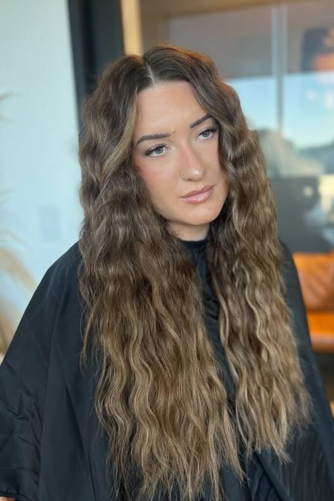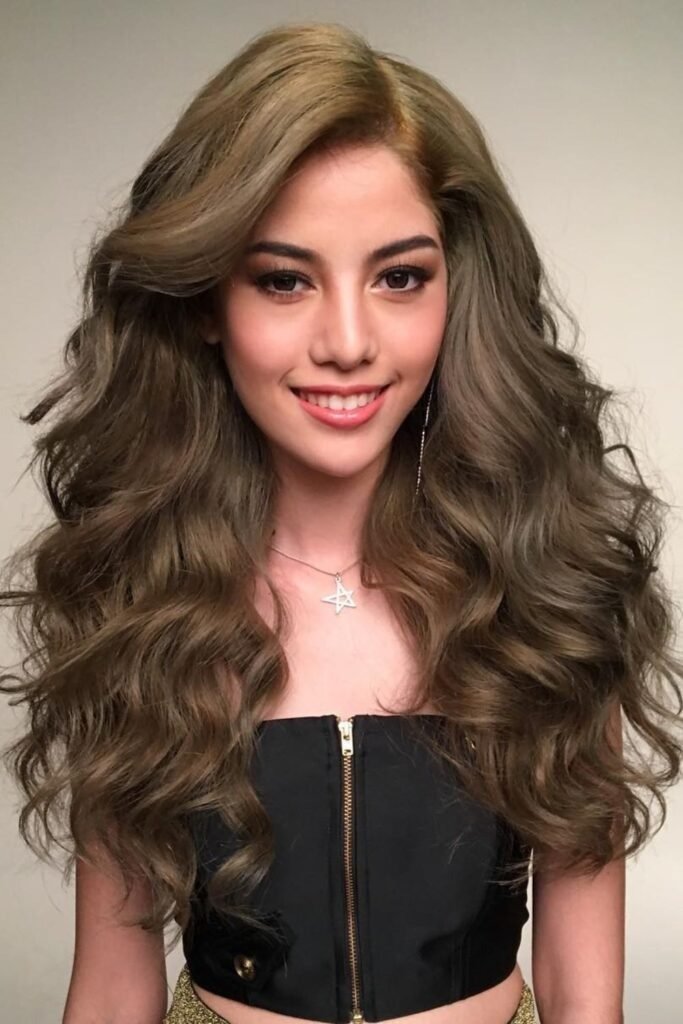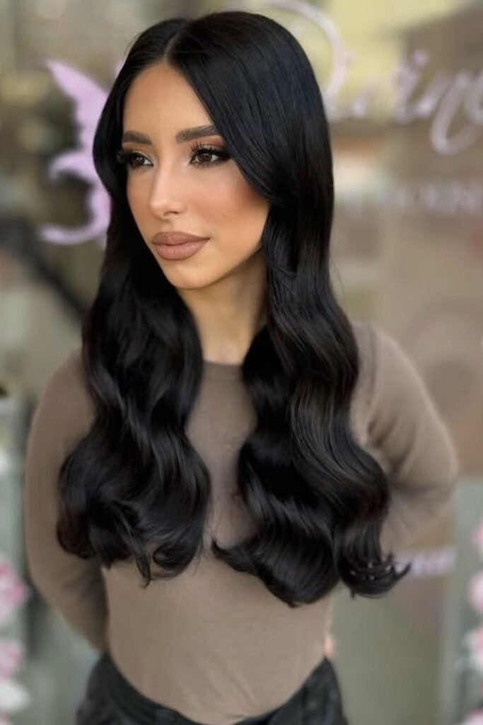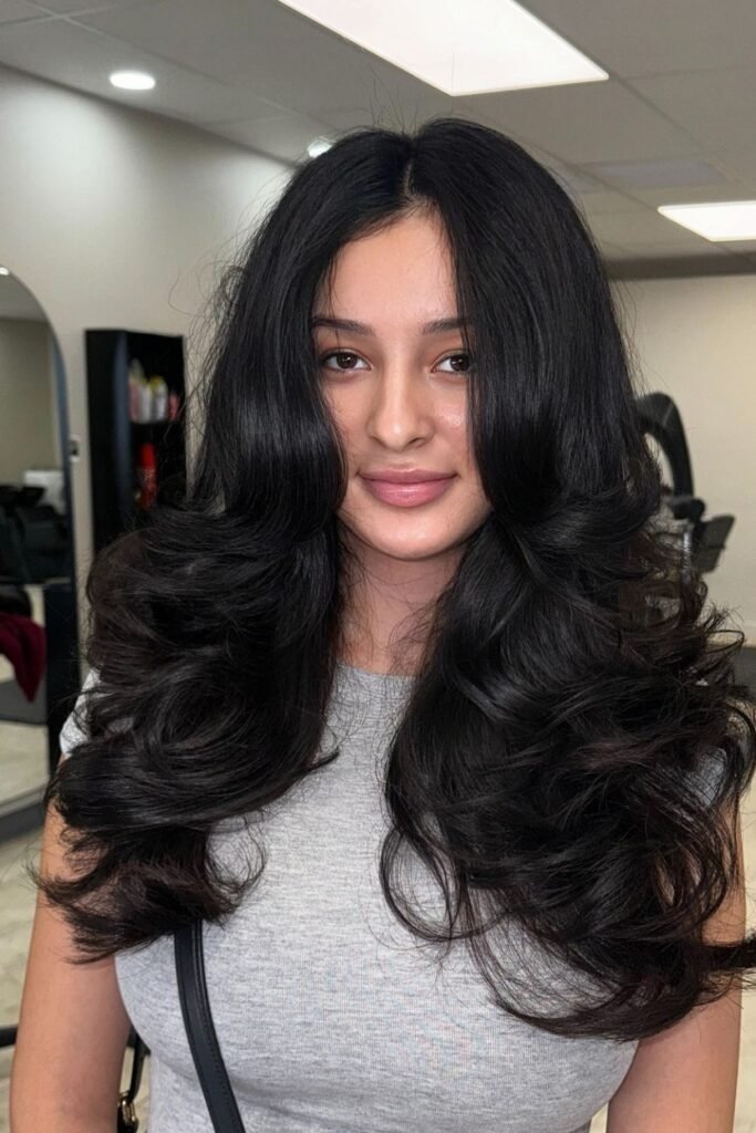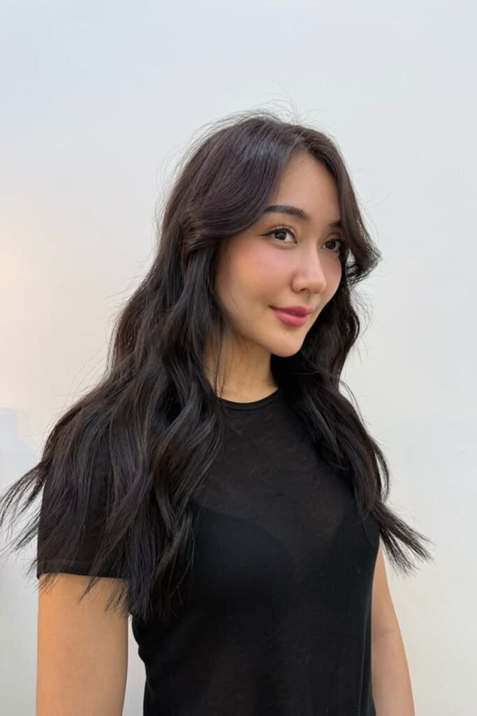 Glossy deep waves focus on shine and smooth flow. The haircut itself is simple, with long layers that support larger wave patterns. This style works best when the ends are clean and blunt enough to reflect light. It suits people who like a polished look but still want natural movement. With proper care, this cut looks just as good loose as it does styled.