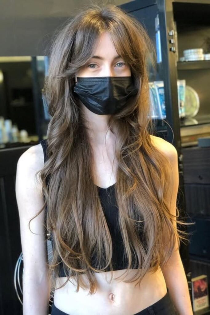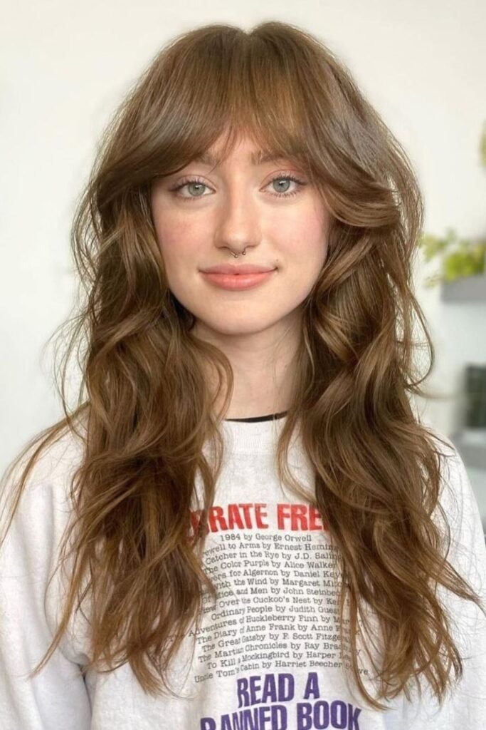 Soft fringe waves add a gentle fringe that blends into long layers. The fringe moves with the waves, creating a natural finish. It suits many face shapes and adds personality.