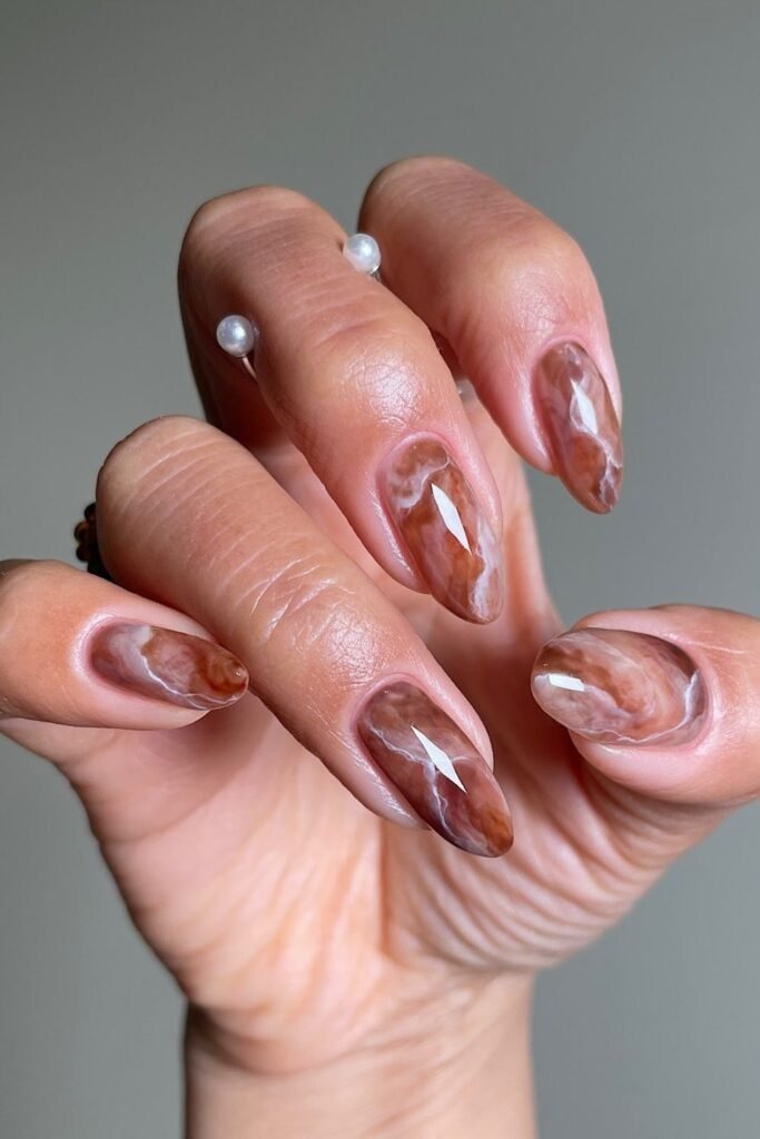 Deep brown marble nails bring a grounded and calm look. This style uses rich brown mixed with soft cream or beige lines. The contrast is smooth, not sharp, which keeps the design wearable. It works well on medium and short nails and fits everyday wear. In 2026, deep brown marble is popular because it feels warm and clean without being dark or heavy.
