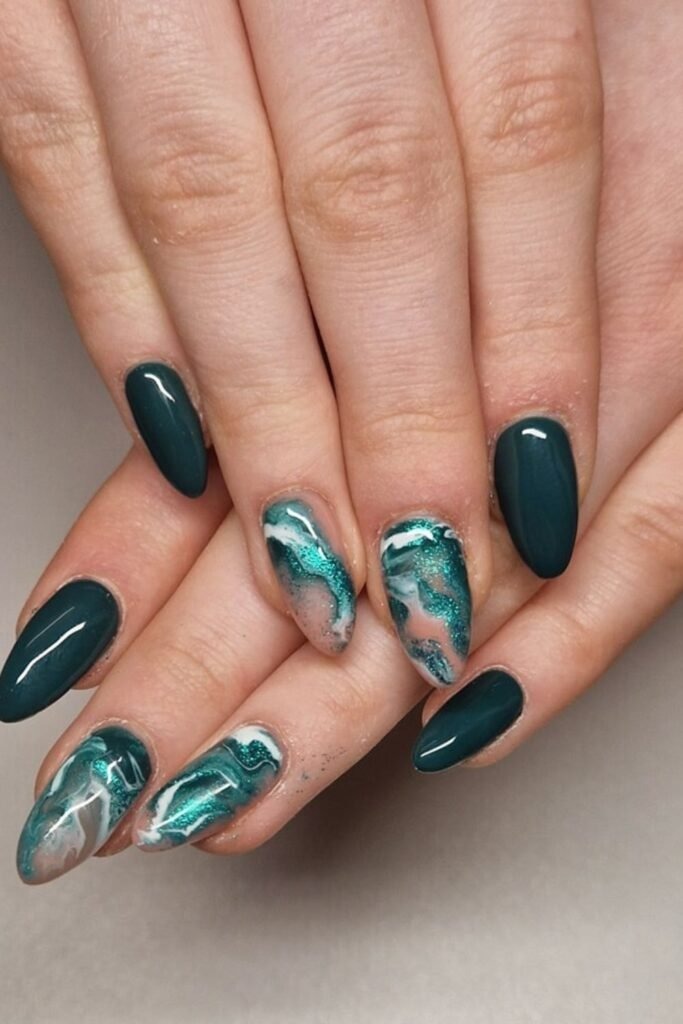 Teal mirage marble mixes teal blue with hints of gray and white. The colors move gently, giving a calm water-like effect. This design looks best with a glossy top coat to show the flow clearly. It suits both short and long nails and is popular for people who want color without brightness.