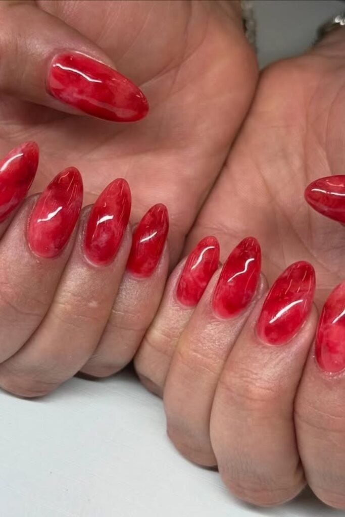 Cherry quartz marble blends soft red with milky pink and clear white tones. The result looks smooth and slightly translucent. This style feels warm and gentle, not loud. It is a favorite in 2026 for people who want a hint of red without going full bright.