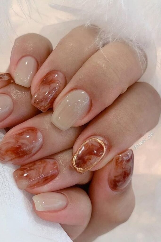 Amber glow marble uses honey-like shades mixed with cream and light brown. The colors flow slowly across the nail, creating a smooth stone effect. This design works well on longer nails and gives a soft shine when finished with gloss. It is popular for fall and winter looks.