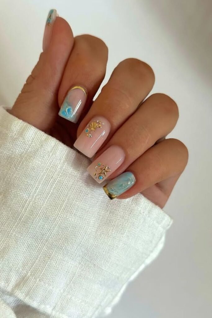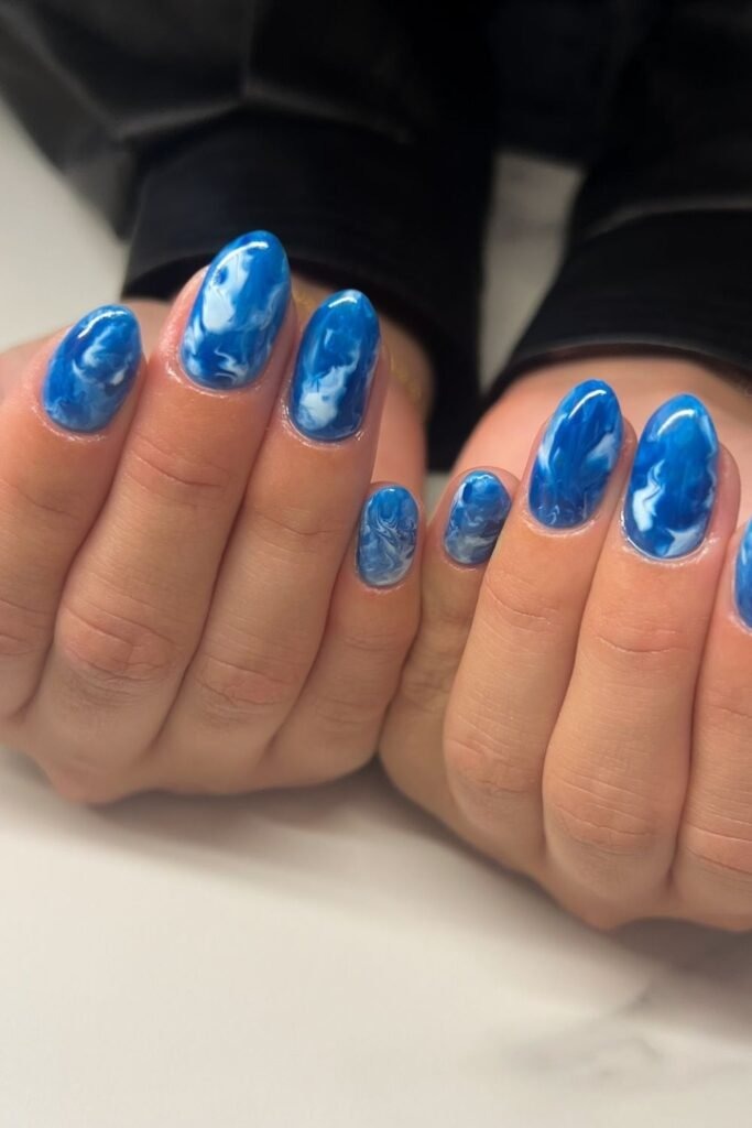 Ocean mist marble mixes pale blue, white, and gray. The design feels calm and fresh. The blend is soft, like fog over water. This style suits square or squoval nails and looks best with a smooth, shiny finish. It is often chosen for everyday wear.