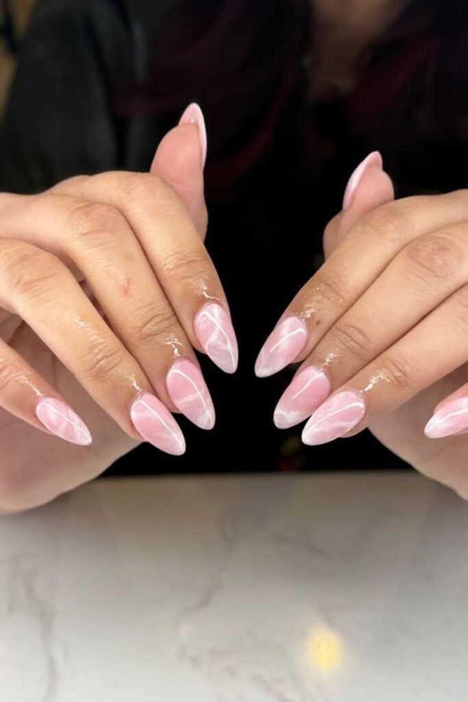 Cotton candy marble uses soft pink and light blue mixed with white. The colors stay muted, not bright. This keeps the design playful but still clean. It works well on shorter nails and is popular with younger audiences in 2026 because it feels fun but not childish.