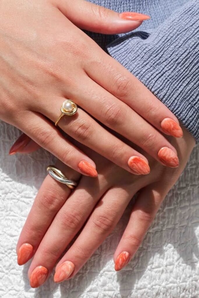 Tangerine glow marble blends soft orange with cream and peach tones. The colors are warm but not strong. This design brings life to the nails without overpowering them. It is popular in summer months and works well on rounded nail shapes.