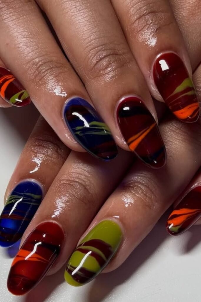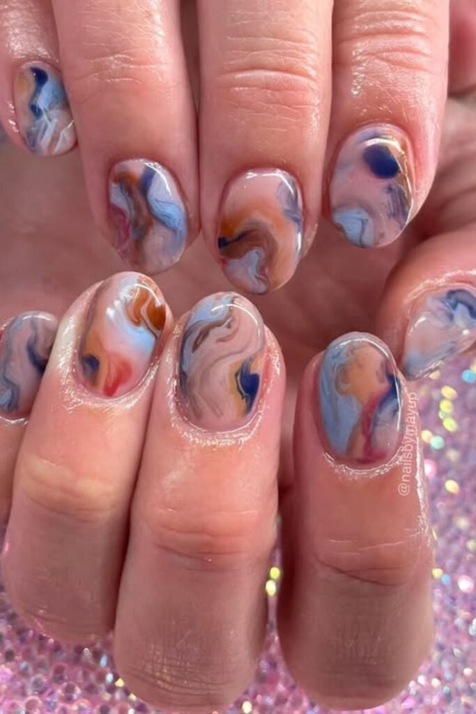 Sunset swirl marble blends peach, pink, and soft orange. The colors flow gently across the nail. This design feels warm and smooth. It works best on medium to long nails where the color movement can show clearly.