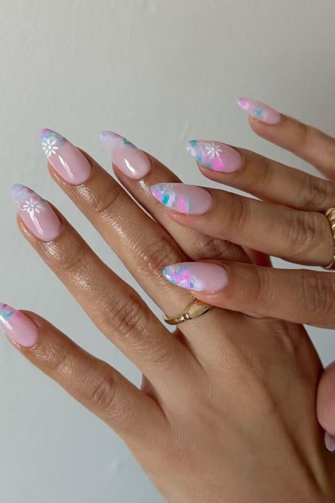 Pastel bloom marble blends light pink, soft yellow, and pale blue. The colors melt into each other gently. This creates a fresh and clean look. It is popular in spring and works well on short nails.