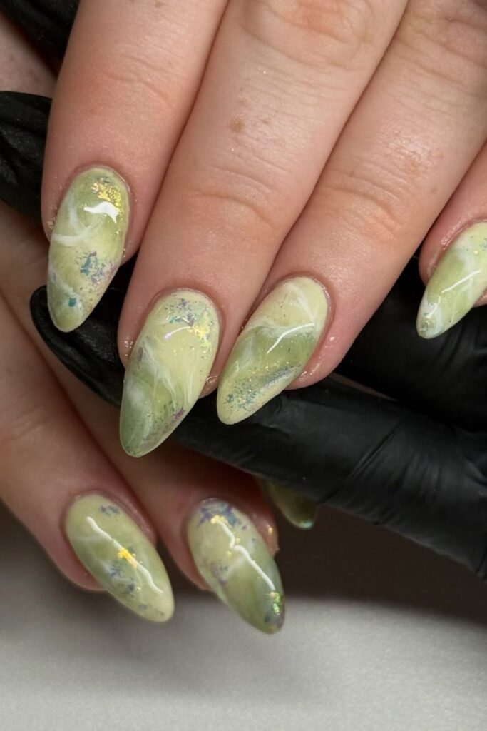 Matcha mist marble blends soft green with white and beige. The colors feel calm and natural. This design is popular for its clean and earthy look. It pairs well with simple nail shapes and short lengths.