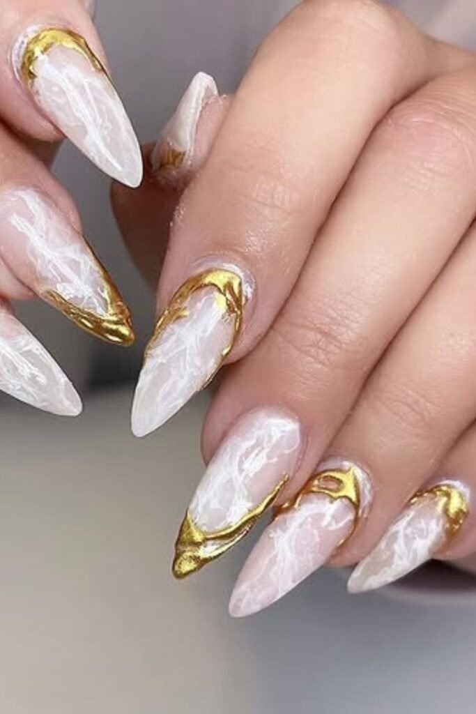 Gilded stone marble mixes neutral stone colors with soft gold touches. The gold is placed lightly, not across the whole nail. This keeps the design balanced. It works well for events but still feels wearable for daily use.