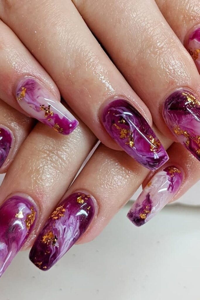 Orchid vein marble uses soft purple with thin white or pale pink lines. The pattern feels light and airy. This design works well in spring and summer and fits almond or oval nail shapes. The gentle purple tone keeps the nails looking fresh rather than bold.