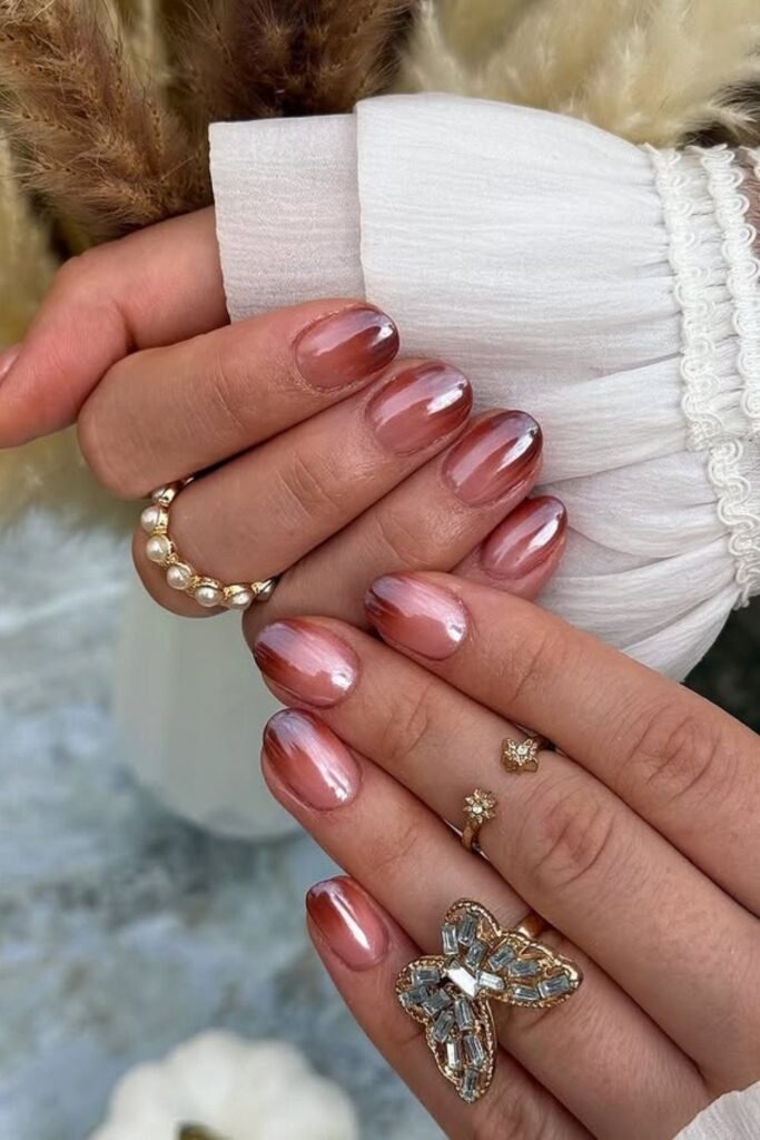 Chrome and glass finishes are used lightly, not heavily. The shine supports the fade instead of covering it. Matte ombre is also making a quiet return, especially for soft pinks and peaches.