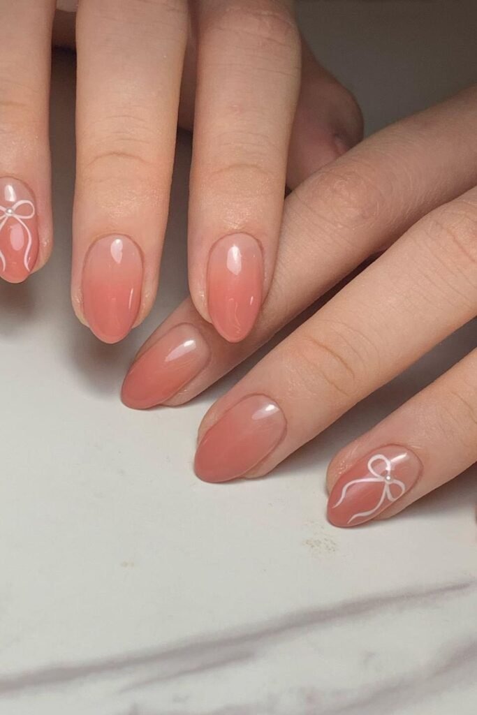 This design blends light coral into soft pink or nude shades. Tiny bow details are added carefully so they do not overpower the fade. The base remains simple and clean. This ombre works best on short to medium nails and is popular for spring and early summer.