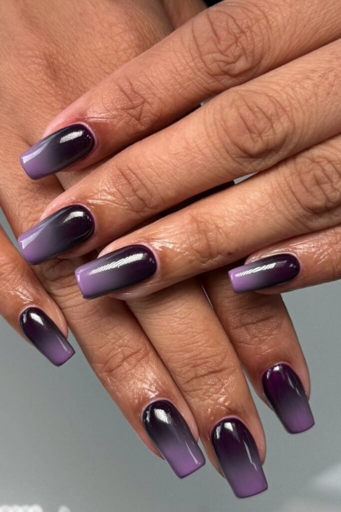 Plum fade mixes deep purple with softer mauve or nude shades. The color feels rich without being dark. This design is popular for fall and winter. It looks best on almond or coffin nails.
