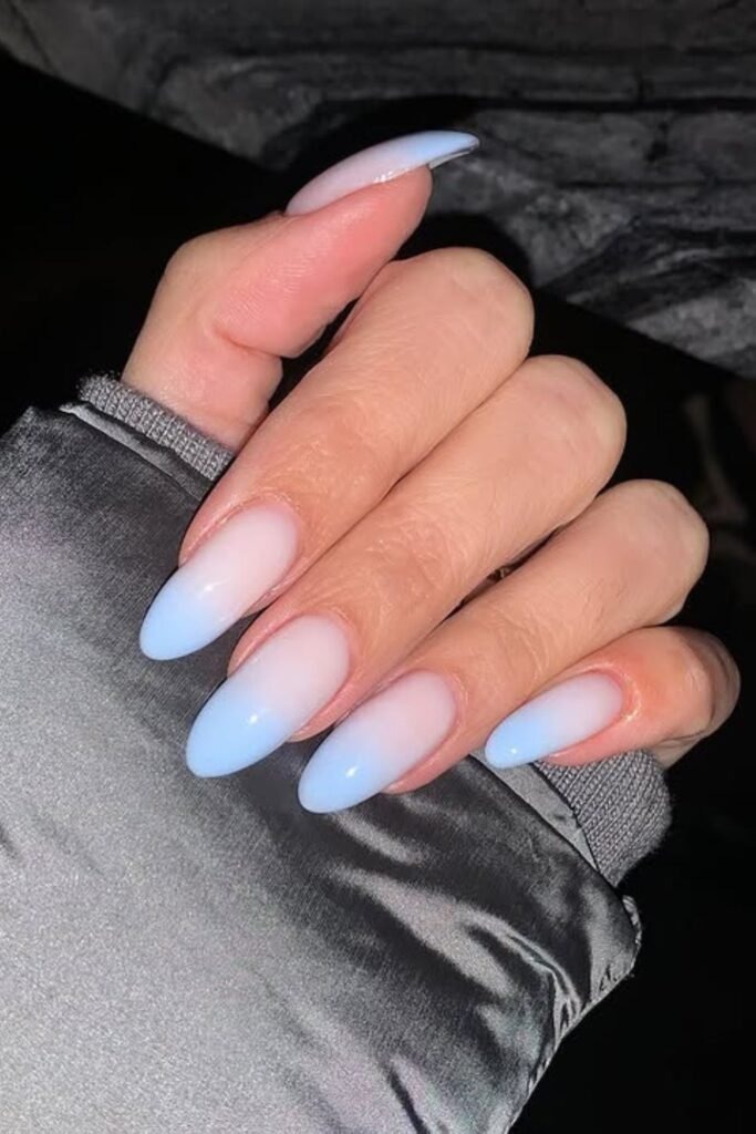 Cloud blue fade blends sky blue into white or pale nude. The look feels calm and airy. This style is often paired with short nails and simple outfits.