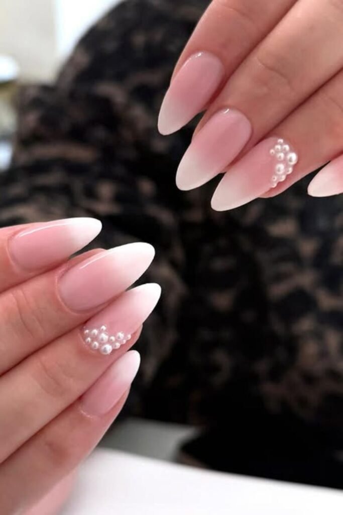 Pearl French fade adds a pearl finish over a classic French ombre. The result is soft shine with a clean base. This style is often chosen for weddings and formal events.