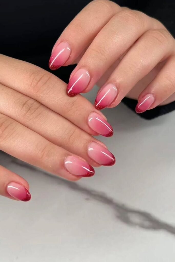Cherry fade blends deep red into soft pink or nude. The color shift is smooth and elegant. This design looks best with a glossy finish and medium-length nails.