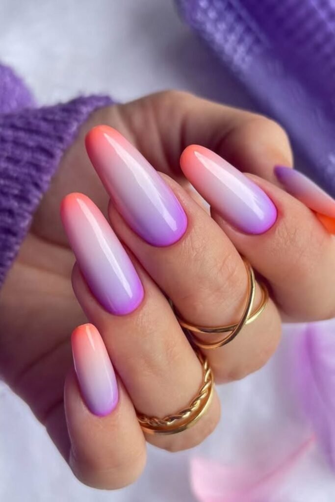 Sunset glow ombre uses warm shades like orange, pink, and soft yellow blended gently together. The colors stay muted, not bright. This design works best on longer nails where the fade has room to flow. It is often chosen for vacations and summer events.