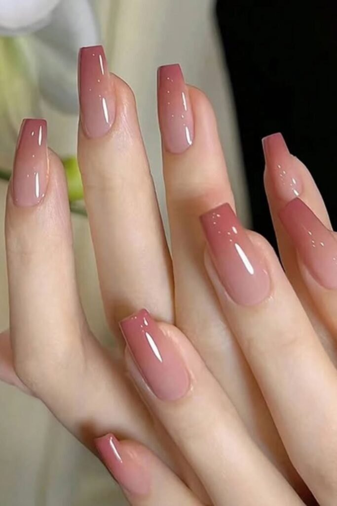 Nude rose fade blends soft rose pink into beige or nude. This style looks natural and polished. It suits all skin tones and nail shapes.