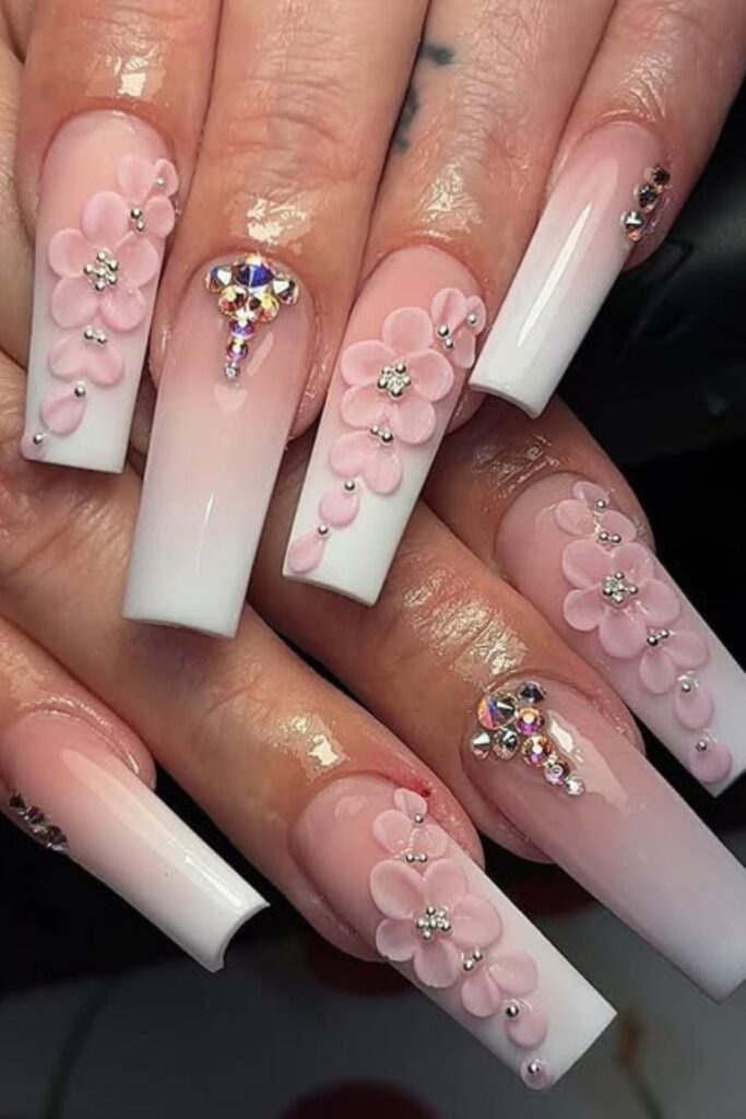 Floral luxury ombre uses a soft base fade with small floral details added lightly. The flowers do not cover the whole nail. This design feels delicate and thoughtful.